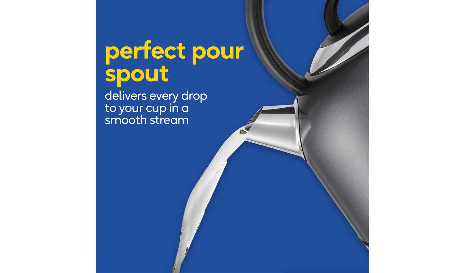 This grey kettle gives a sleek and clean look to this sizeable 1.5L traditionally styled kettle. A perfect pour spout, pull-to-open lid and 360 degree base make handling super smooth.