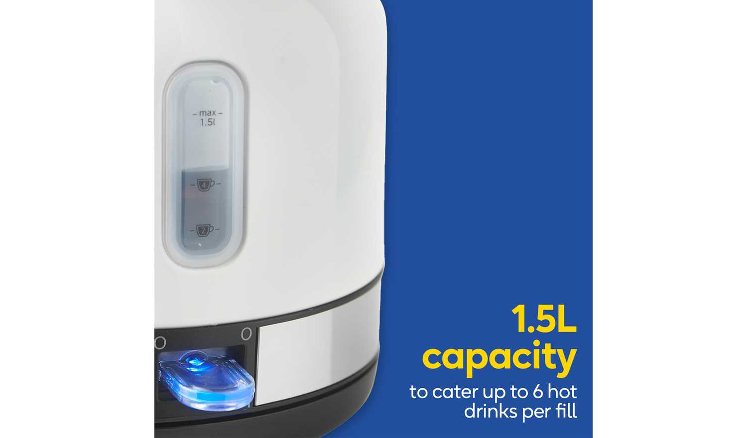 A perfect pour spout, pull-to-open lid and 360 degree base make handling super smooth. This white kettle gives a sleek and clean look to this sizeable 1.5L traditionally styled kettle.