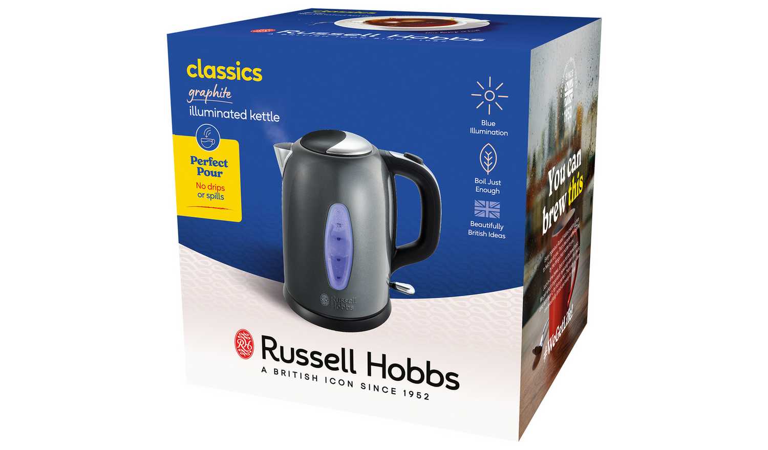 The Russell Hobbs Classics Illuminated Kettle - Grey looks great on your worktop thanks to it's sleek stainless steel finish, and it accommodates the whole household in one go with it's 1.7L capacity. It's super efficient and energy saving with 3kW power and rapid boil markers helping you boil only what you'll use. The perfect pour spout, push-to-open lid and 360 degree base make operating it a breeze, and a 47-second boil time for 1 cup means it's coffee time, any time.