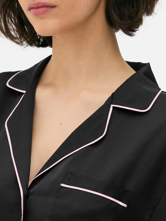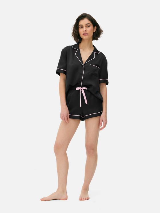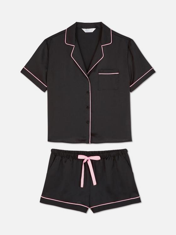 Slip into sweet dreams with these elegant black satin pyjamas, detailed with delicate pink piping. The short sleeve top features classic lapels, a chest pocket and button-through front for a refined touch, while the coordinating shorts come with a comfy elasticated waist and pink drawstrings. Perfect for those warm summer nights or lounging at home in style, the contrast trim adds just the right amount of charm to elevate your nightwear collection. Team with fluffy slippers and a matching robe for the ultimate relaxation ensemble, or wear the top with jeans for an unexpected daytime twist.