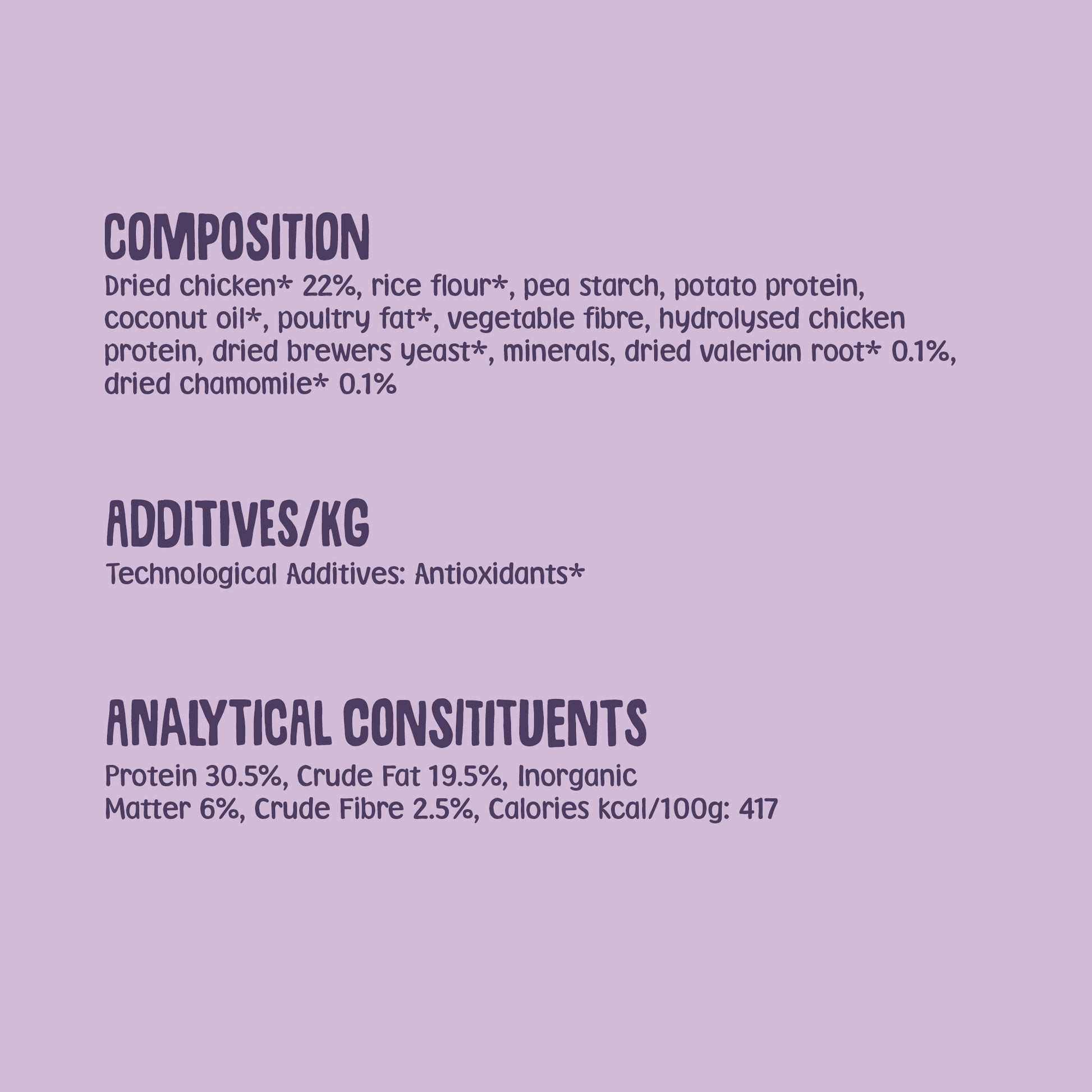 Dried chicken* 22%, rice flour*, pea starch, potato protein, coconut oil*, poultry fat*, vegetable fibre, hydrolysed chicken protein, dried brewers yeast*, minerals, dried valerian root* 0.1%, dried chamomile* 0.1%.