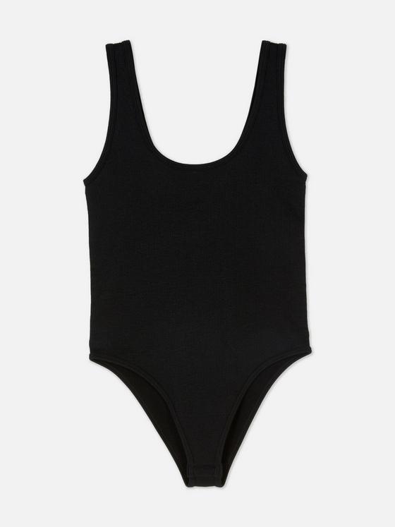 This scoop neck bodysuit, in a rib fabric, benefits from a seamless design