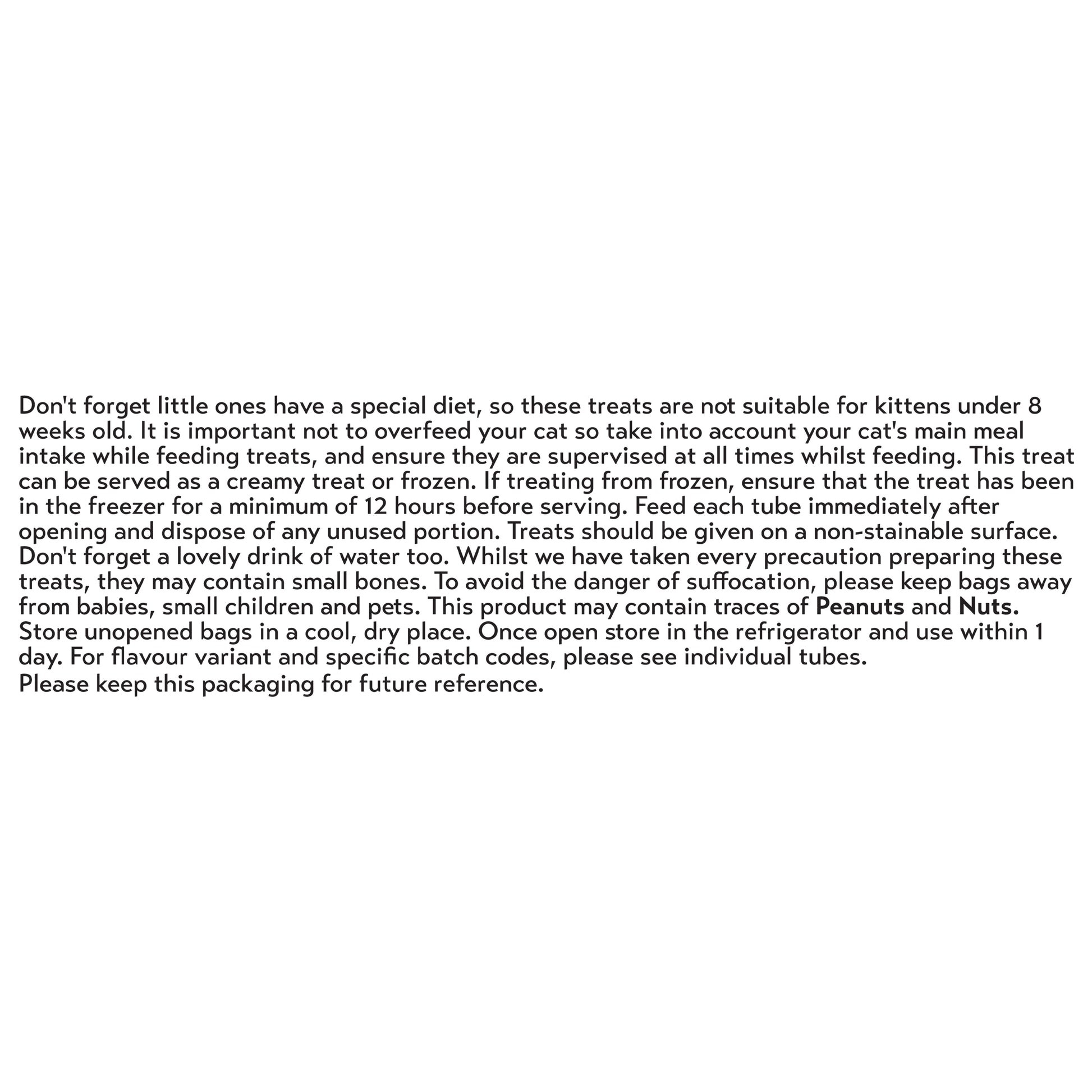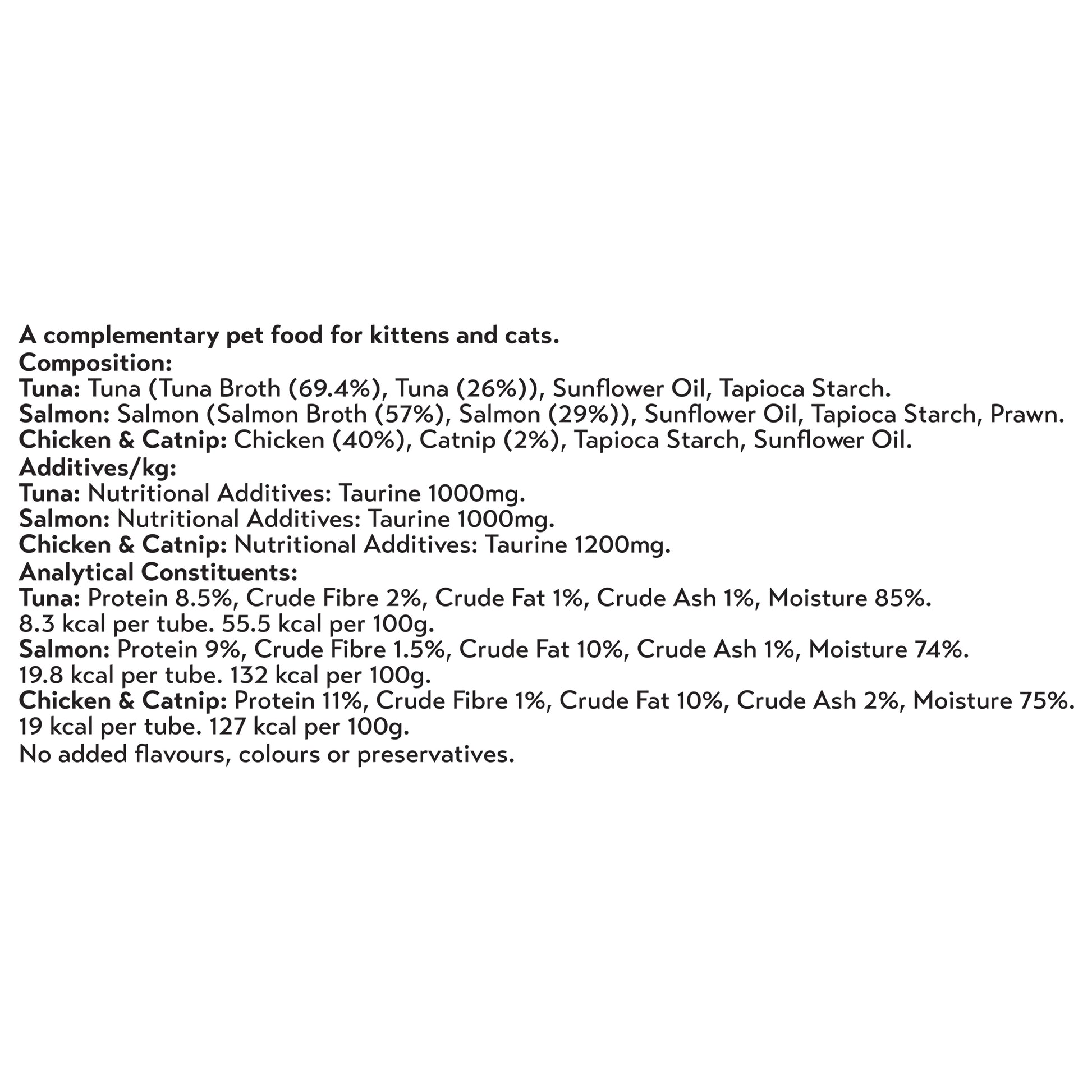 These lickable treats give your kitten a tasty burst of flavour and smooth texture they'll love. Serve one of these tasty flavours as a treat straight from the tube, frozen as a cooling treat, in a dish or use as a tasty topper for their regular meals. With added taurine to help support healthy heart and eyes, natural ingredients with added vitamins and minerals these tubes are irresistibly tasty and hydrating. Pack includes the following tempting flavours; 5x Tuna, 5x Salmon and 5x Chicken with Catnip offering plenty of options for your cat to devour!