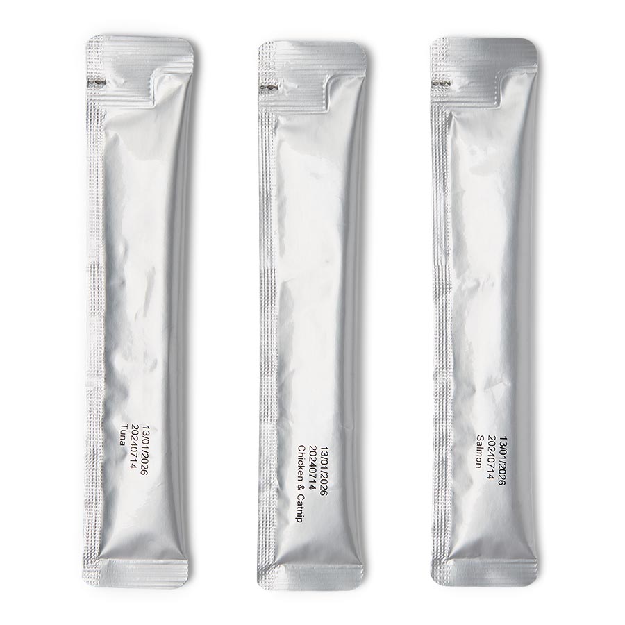 Tuna: Tuna (Tuna Broth (69.4%), Tuna (26%)), Sunflower Oil, Tapioca Starch. Salmon: Salmon (Salmon Broth (57%), Salmon (29%)), Sunflower Oil, Tapioca Starch, Prawn. Chicken & Catnip: Chicken (40%), Catnip (2%), Tapioca Starch, Sunflower Oil