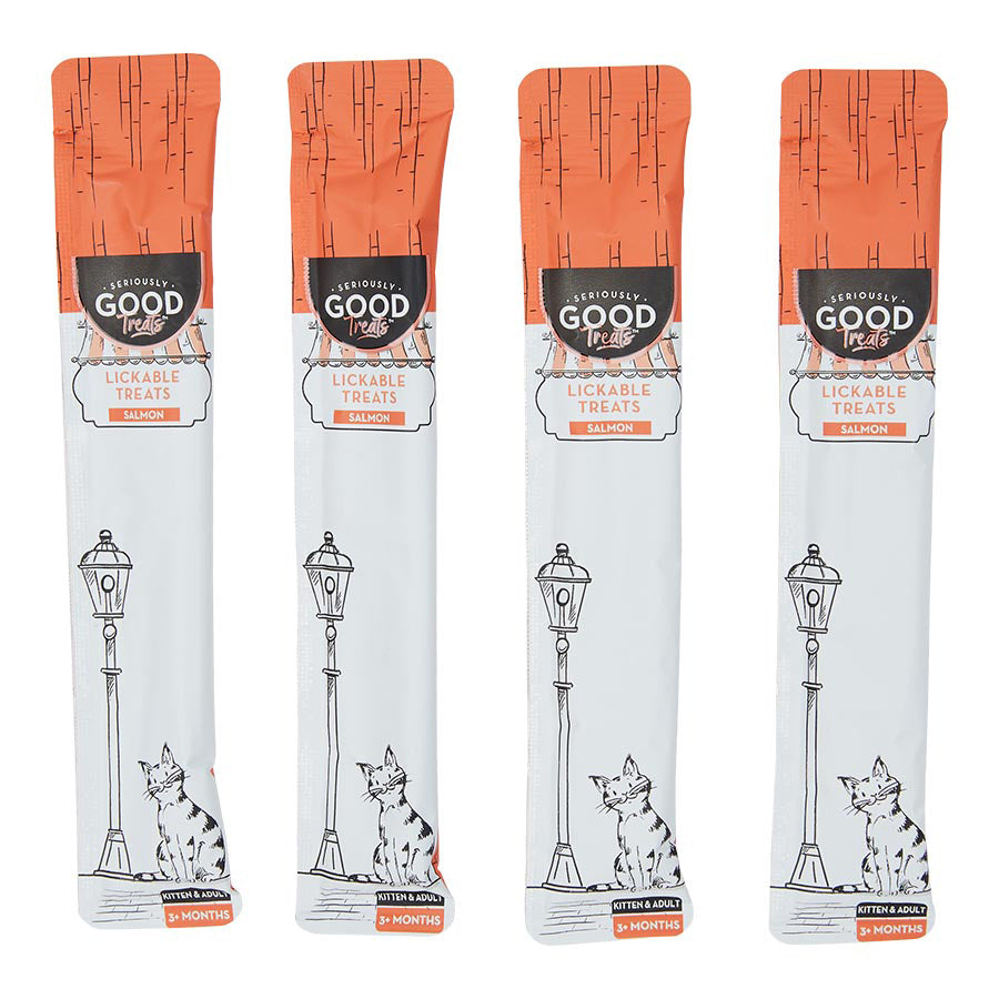 Seriously Good Creamy Lickable Treats are fun way to give your feline friend a little reward. Four in a pack, these treats are a delicious blend of creamy salmon, which includes taurine - the essential amino acids for cats that help promote a healthy heart and improves eye strength. These convenient tubes can be stored in the freezer, making them a purrfect treat on a hot a day. Just squeeze and feed your cat directly from the tube, creating a lovely bonding experience between you and your beloved cat.