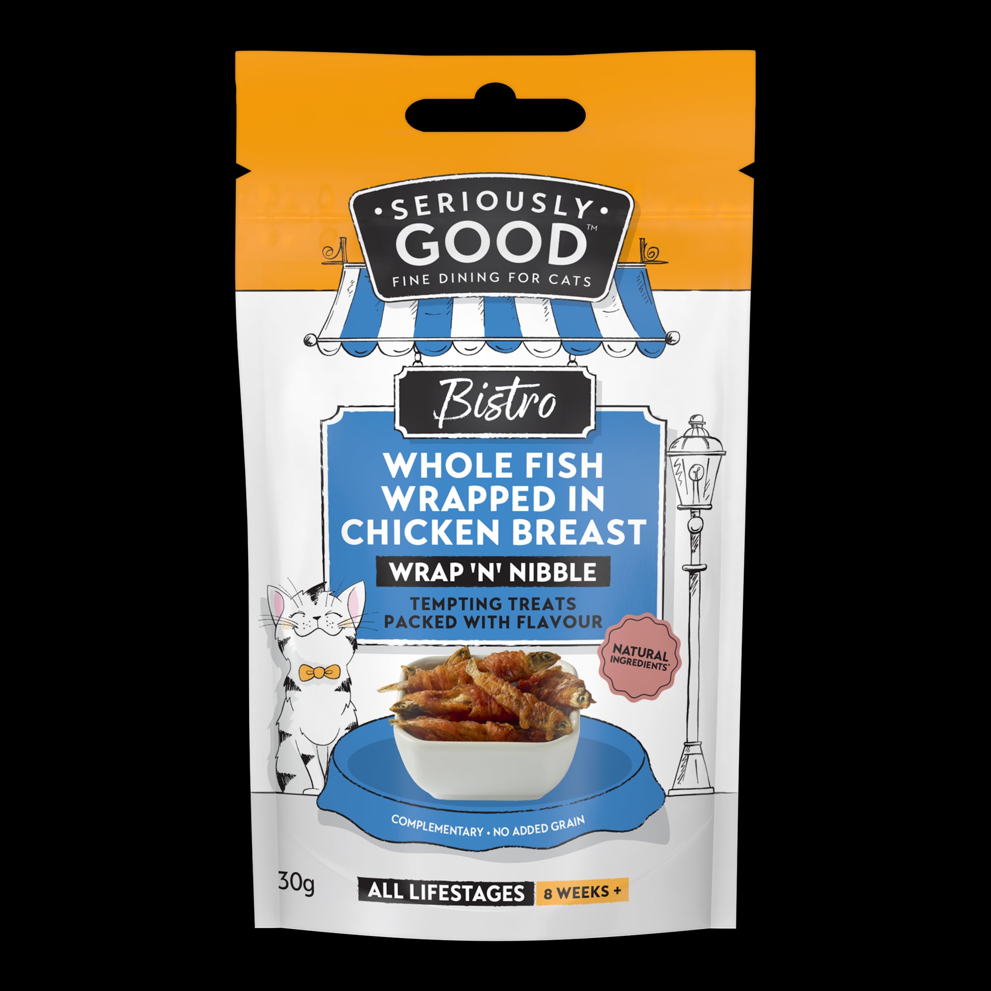 This Seriously Good Wrap 'N' Nibble Cat Treats are whole fish wrapped in tasty chicken breast that will give your cat a tasty burst of flavour and soft meaty texture they'll love. They are made with no added flavours, colours or preservatives. Serve as a tasty treat or reward.