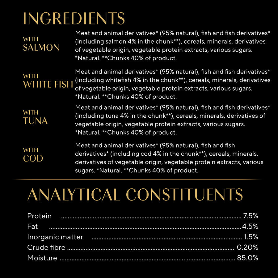 Meat and animal derivatives* (95% natural), fish and fish derivatives* (including salmon 4% in the chunk**), cereals, minerals, derivatives of vegetable origin, vegetable protein extracts, various sugars, Natural Chunks 40% of product
