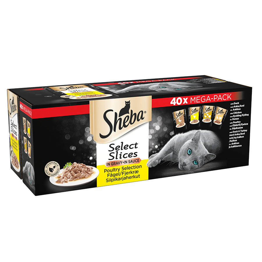 Sheba Select Slices wet cat food is a deluxe medley of tender pieces in a delicious gravy your cat will adore. Exceptional Sheba cat food with Poultry in Gravy keeps your feline friend pawing at your feet for more. Choose handy Sheba Select 40 x 85g cat food pouches. A 100% Complete and Balanced wet cat food with no artificial colours or preservatives.