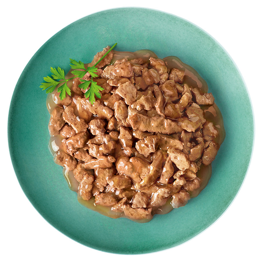 A medley of carefully selected, tender slices in a delicious gravy. An enticing, go-to wet cat food recipe with textures your cat will adore. Available in 85g convenient cat food pouches.