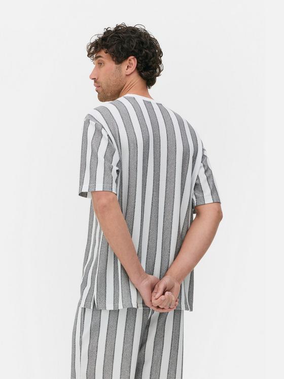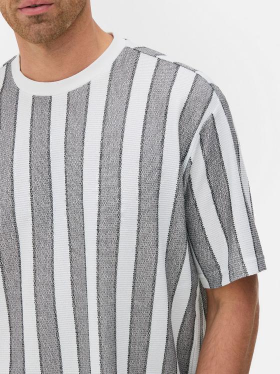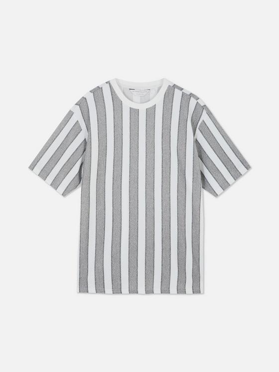 This short sleeve stripe t-shirt features a clean and classic design with a modern twist. The vertical stripes alternate between a textured grey and crisp white, giving it a subtle contrast that stands out without being loud. Finished with a round white neckline, it offers a relaxed yet polished look. Pair it with jeans or chinos for an easy weekend outfit, or style it with tailored shorts and trainers for a smart-casual summer vibe.