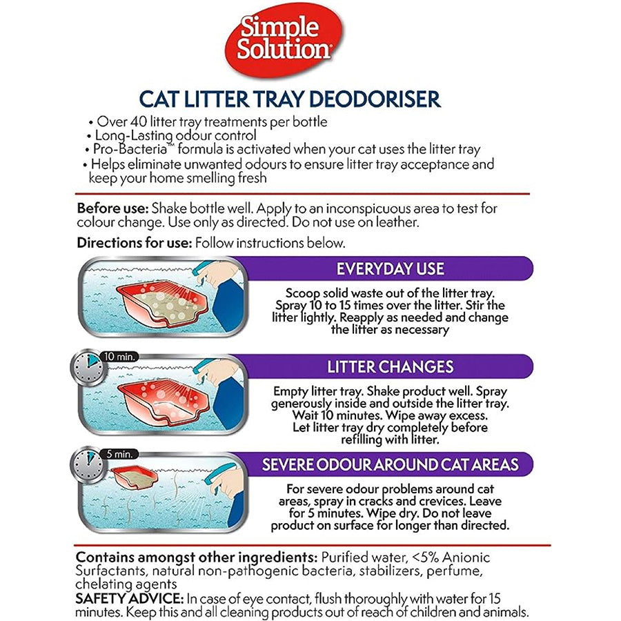 Simple Solution Cat Litter Odour Eliminator Spray breaks down stuck-on urine and faeces, completely removing odours to ensure litter tray acceptance. The formula digests odour causing residue and is activated when your cat uses the litter tray. The clump-free spray formula makes it ideal for daily use.