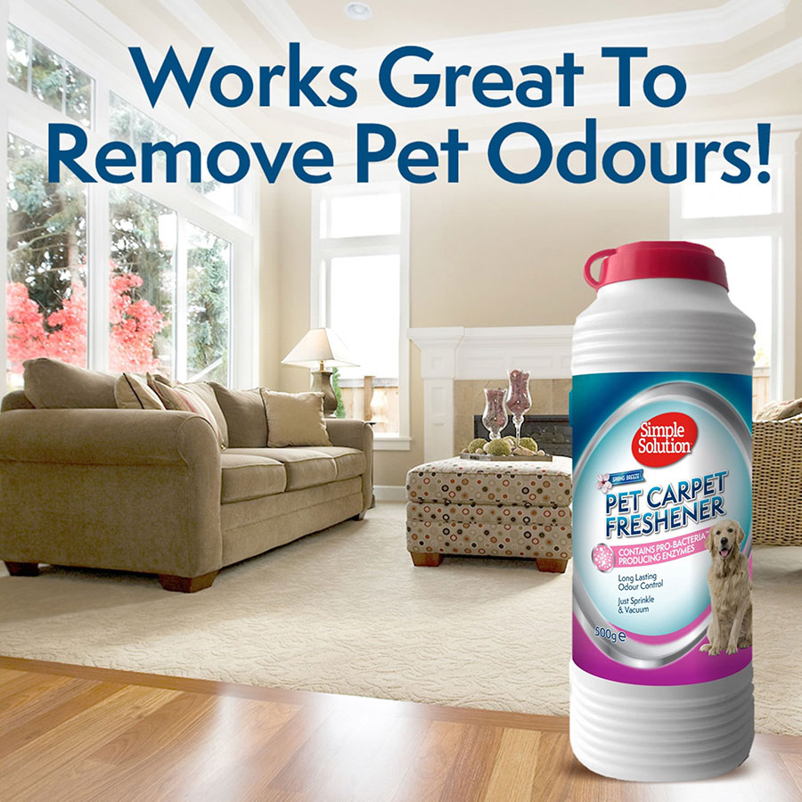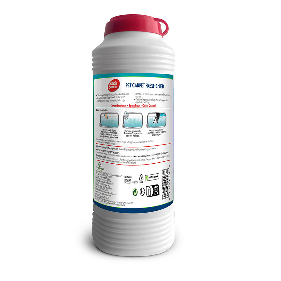 Remove lingering pet odours that get trapped in carpets and upholstery with this pet carpet freshener. Quick and Easy use when you don't have time to shampoo and keeps your home smelling fresh. Contains Pro-Bacteria producing enzymes for Long Lasting Odour Control.