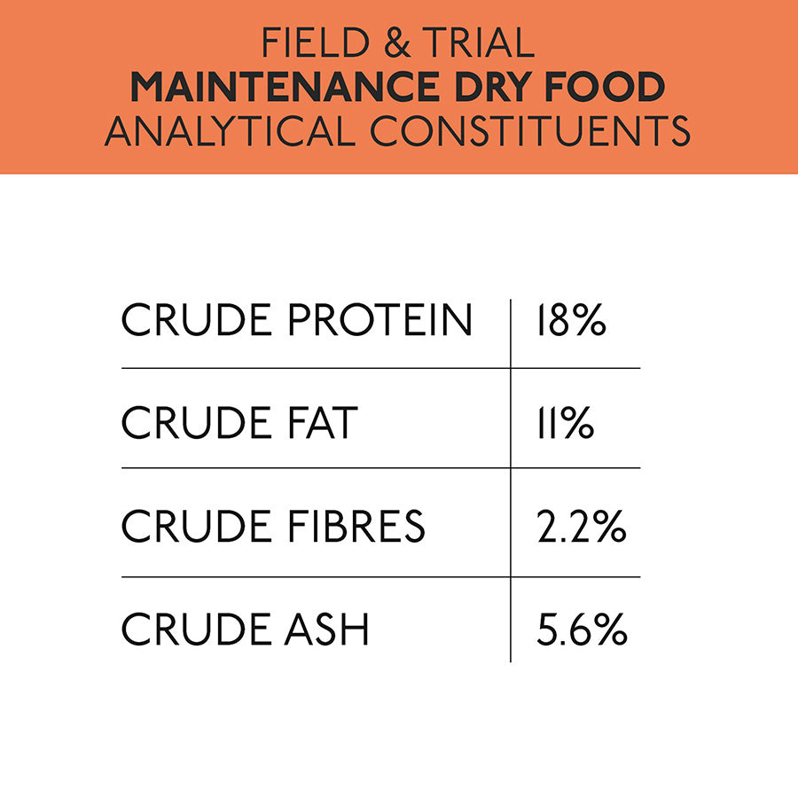 Field & Trial Maintenance provides ideal nourishment for working dogs in light work, or to support them outside of the working season. With slightly lower levels of protein and fat, it's a great everyday food. This is also diet worth considering for dogs a who are prone to weight gain when they are taking it steady and so do not require an energy dense feed. This can help to reduce energy intake and help prevent excess weight gain.
