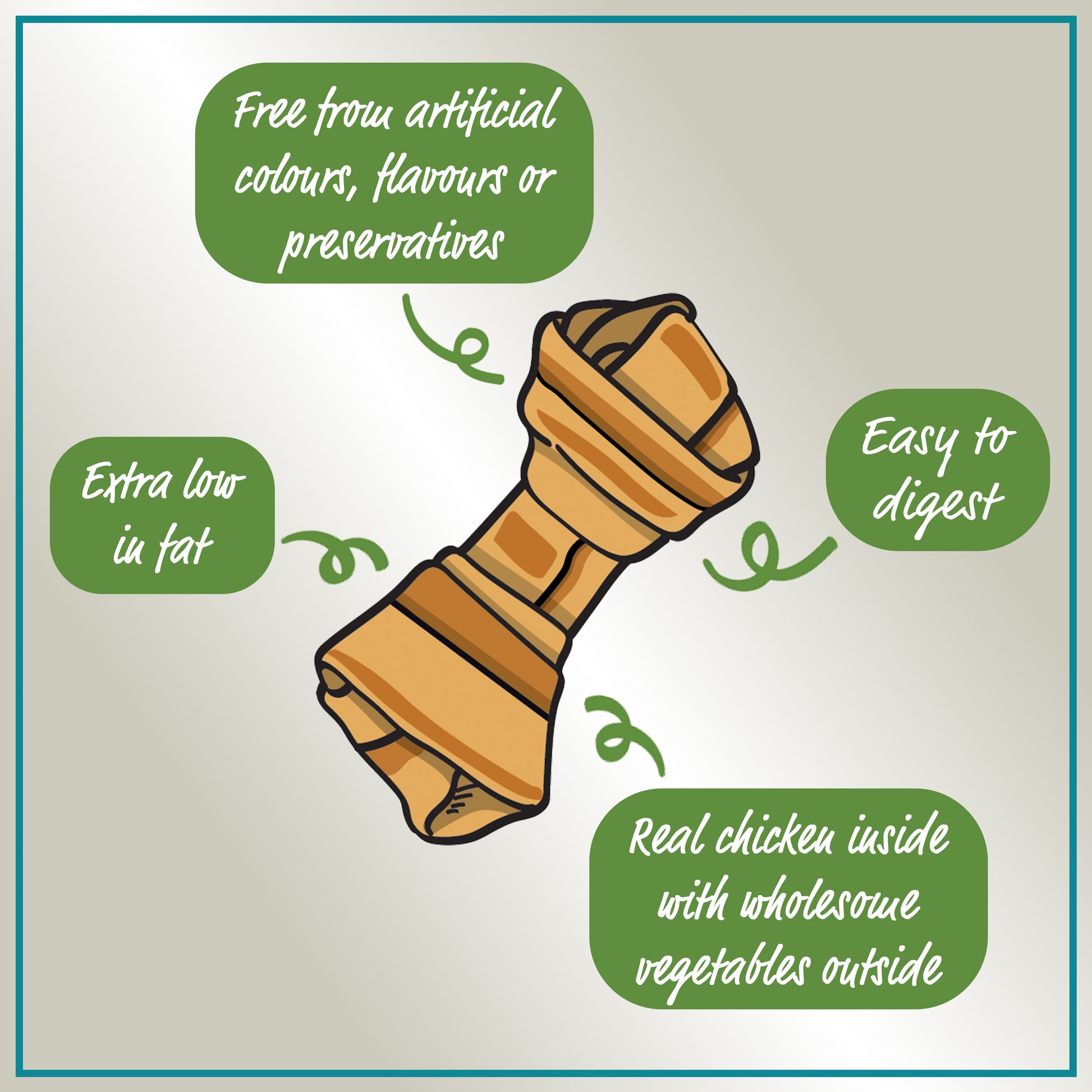 Smartbones Chicken and Vegetable Mini Bone Dog Chews have a chewy rawhide-alternative outer layer - made with tasty vegetables such as sweet potatoes, peas and carrots - and an irresistible inner layer with real chicken breast.