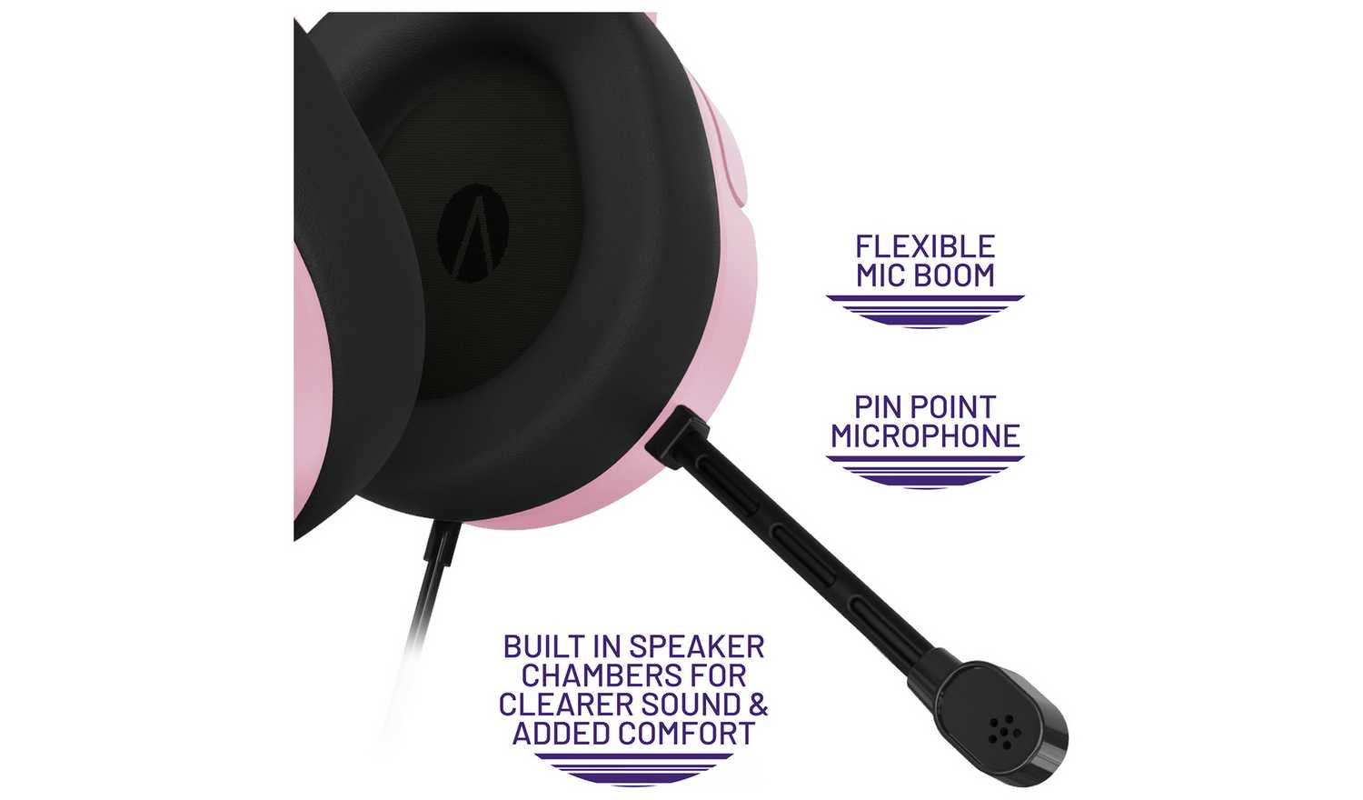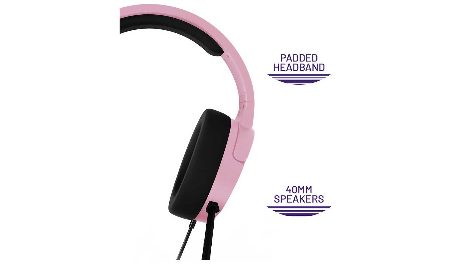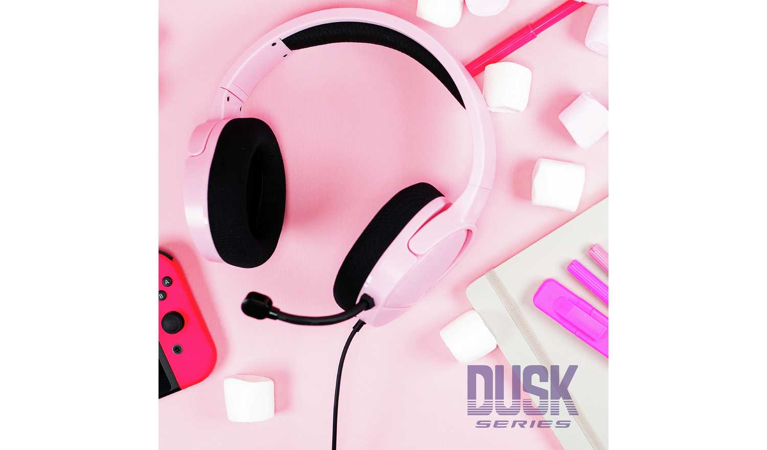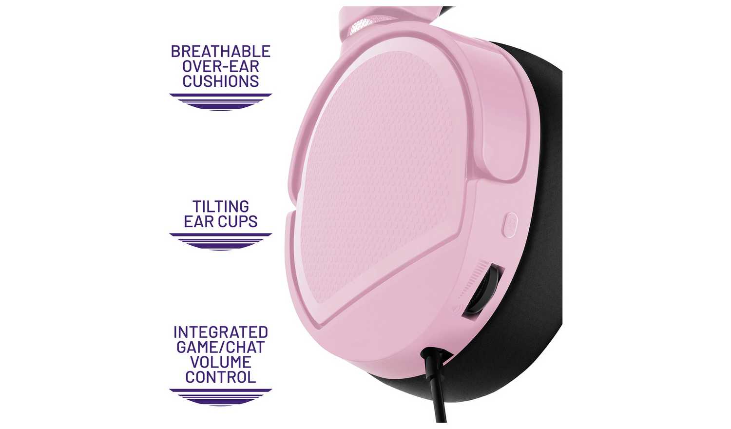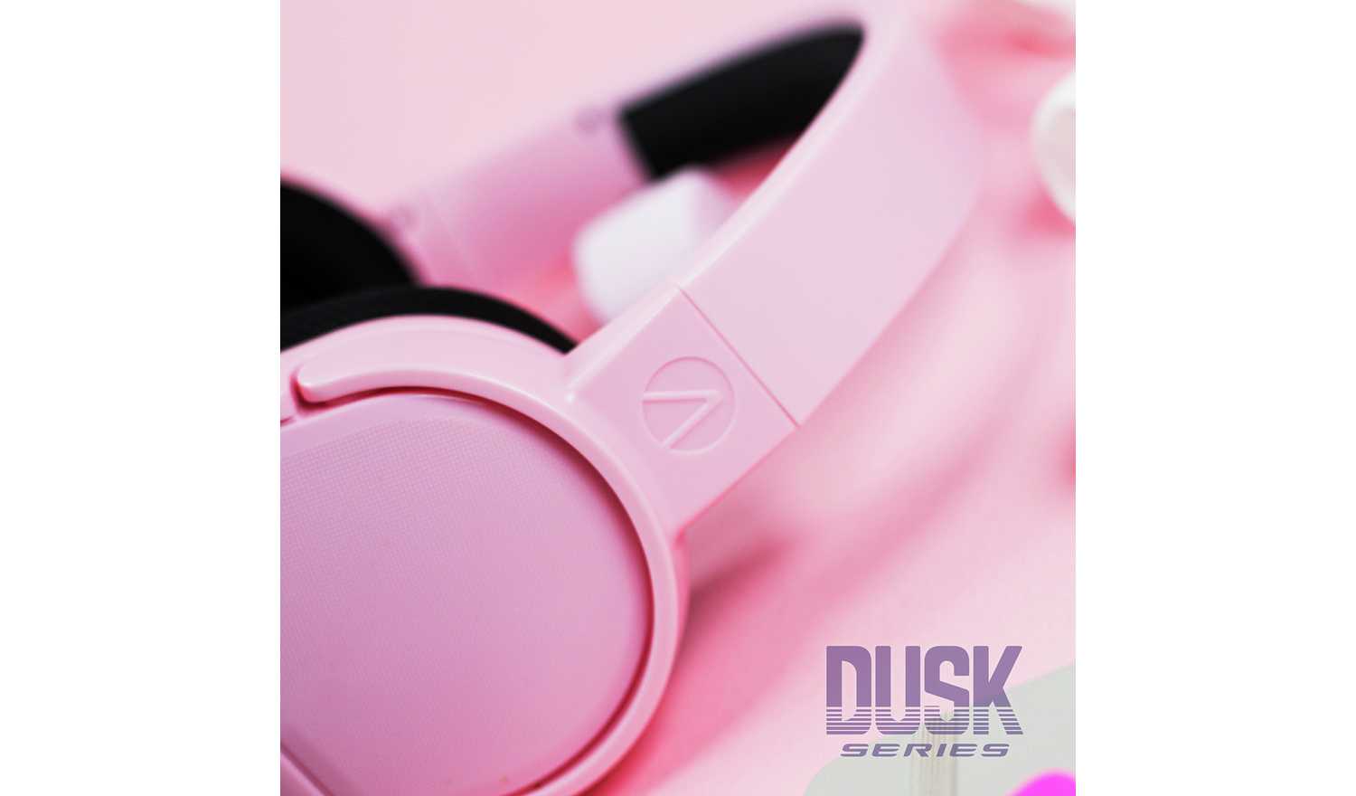 3.5mm jack, volume control and mute functionality. Matte finish in pastel pink with gloss accents.
