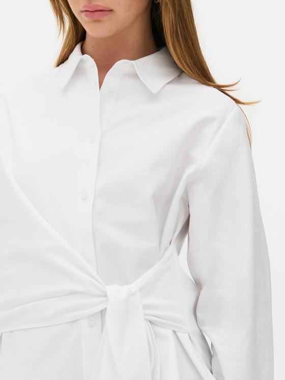 A striped Oxford shirt with collar, long sleeves, tie-front, and button-up front