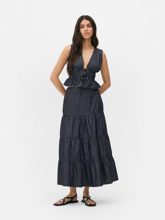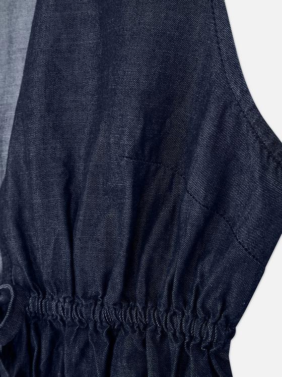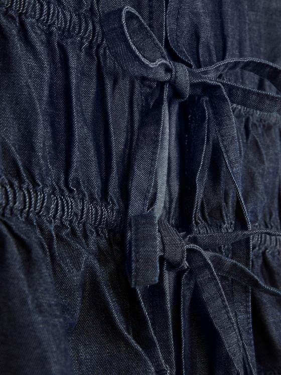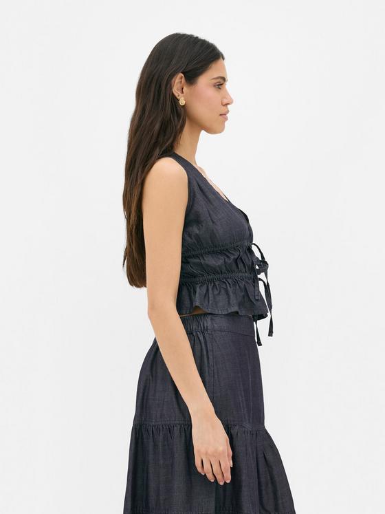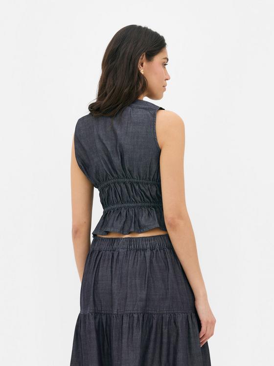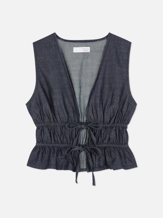Look to a season of stylish moments and get set to steal the sunlight, whatever the day has in-store with this cute denim waistcoat. Cut to a cropped length that's perfect for sun-splashed days, it also features tie details to the front, adding to its fun and fashionable appeal. The V-neckline is an elegant touch, while the ruching creates a figure-flattering finish that softly cinches you in around the middle. This piece has a Western-inspired vibe to it, making it totally on-trend. Team it with a tiered skirt and flat sandals and put on a fun and fashionable display that's bound to bag some compliments!