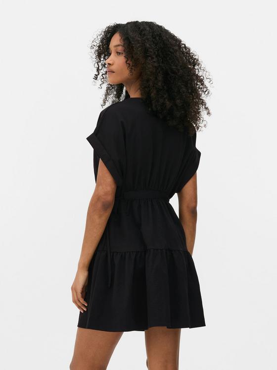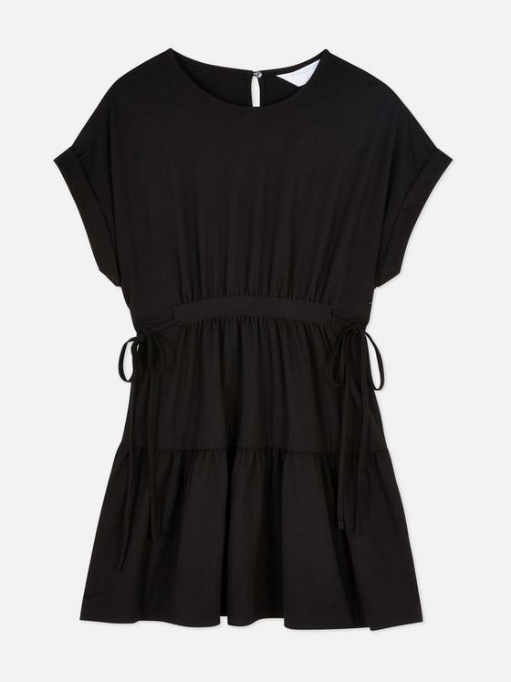 A tiered smock dress cut to a mini length with short sleeves and a crew neckline