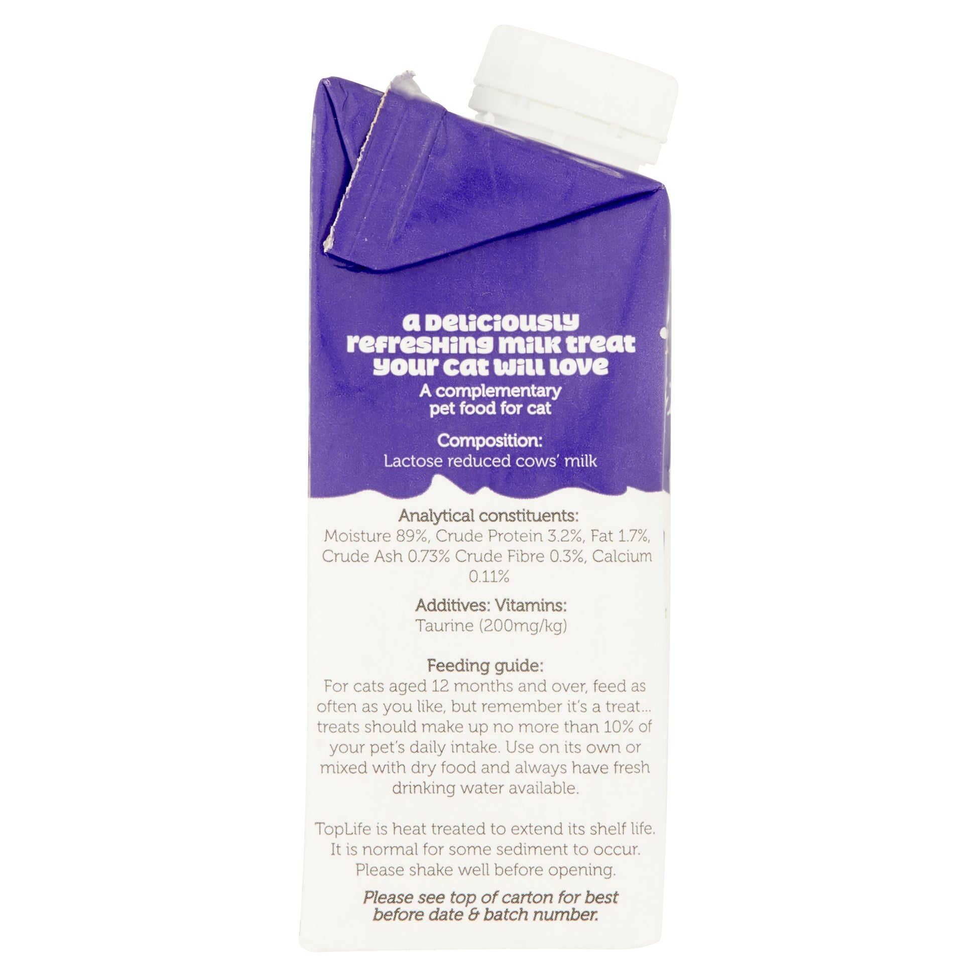 This refreshing treat is a fantastic way to complement your cat's diet, giving you the peace of mind that it is also nutritionally beneficial. Cats love the refreshing and nutritious taste of milk, however the formula of cows' milk can be a bit too much for your furry friend! This TopLife cat milk formula is made from lactose reduced cow's milk, with added Inulin to provide nourishment for good bacteria in your cats' digestive system. Taurine is used to strengthen healthy eyes, all natural health and hydration. Your cat will not be able to get enough, especially if pouring a splash on top of your pet's dry food or to feed on its own as part of a treat. Includes no nasties, no artificial ingredients, colours, flavours or preservatives.