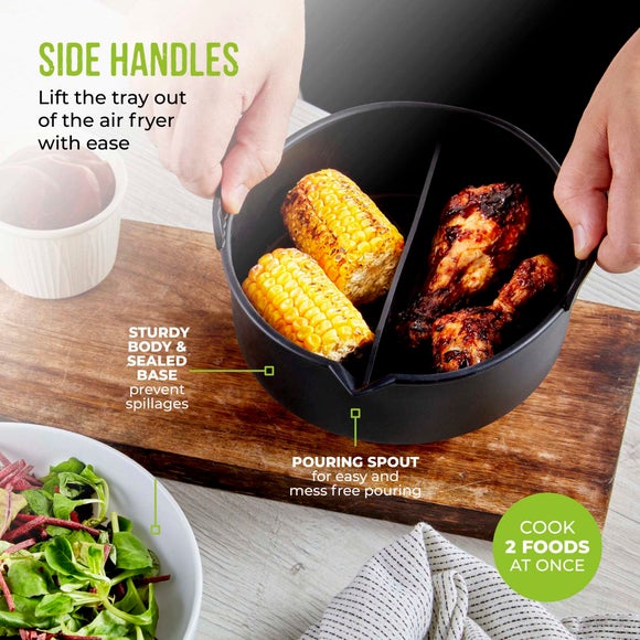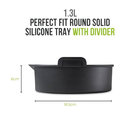 Cook up delicious pizzas, cakes, waffles and more using this Round Silicone Tray, suitable for all Tower Air Fryers. Crafted from superior non-stick silicone material for fuss-free cooking and cleaning, enjoy a delicious homemade Victoria Sponge, Spicy Pepperoni Pizza or sweet Cinnamon Waffle. The ribbed interior on the base of the tray collect fat and oil to provide better air circulation and allow food to be heated evenly. Safely lift the tray from basket to plate using the side handles, whilst the sturdy silicone tray stays in shape, ensuring none of the contents spill over whilst handling. The divider allows you to cook multiple food types at once so you can enjoy delicious crispy chips or moist chicken in no time. The re-usable tray is an eco-friendly alternative to single use parchment liners and is made from 100% food-safe silicone and are odourless and non-toxic. It has a LFGB certification and is guaranteed to be BPA free.