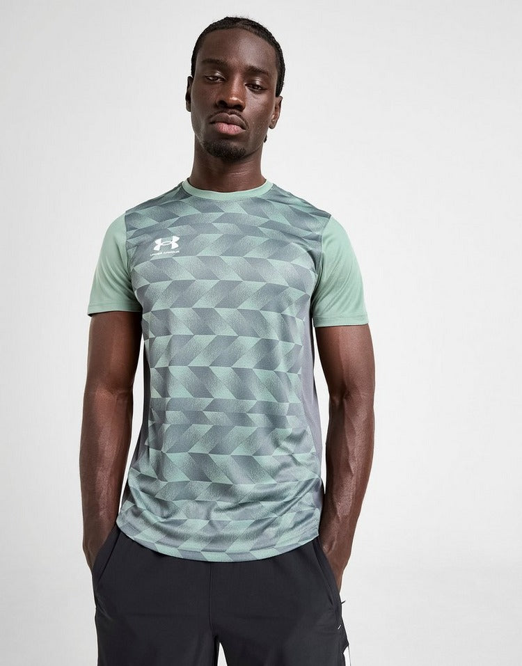 Get in a workout with this men's Challenger Print T-Shirt from Under Armour. In a Silica Green and Castlerock colourway, this standard-fit tee is cut from light and breathable polyester for cool comfort. It features short sleeves with a ribbed crew neckline and is equipped with sweat-wicking tech to remove sweat. With mesh panels for ventilation, it's finished up with signature Under Armour branding. Machine washable | Our model is 6'1" with a 36" chest and wears a size M.
