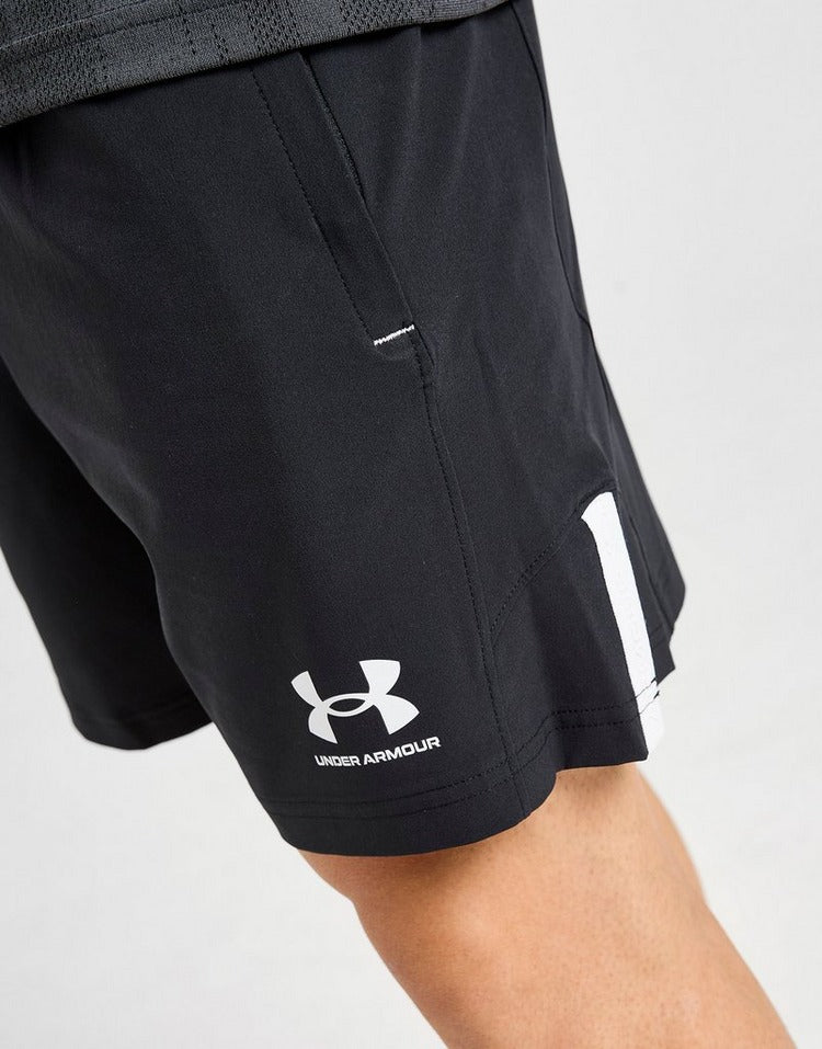 Take on training sessions in these men's Challenger Pro Woven Shorts from Under Armour. In a Black colourway, these shorts are cut from a lightweight, sweat-wicking stretch-woven fabric with a 4-way stretch for cool comfort. They feature an elasticated waistband with an internal drawcord to adjust the fit, while water-repellent UA Storm tech keeps you feeling dry. The side-vent hem offers ventilation, while side zippered pockets provide space to stash away your essentials. Finished up with the Under Armour logo above the hem. Machine washable. | Our model is 6'0" and wears a size M.