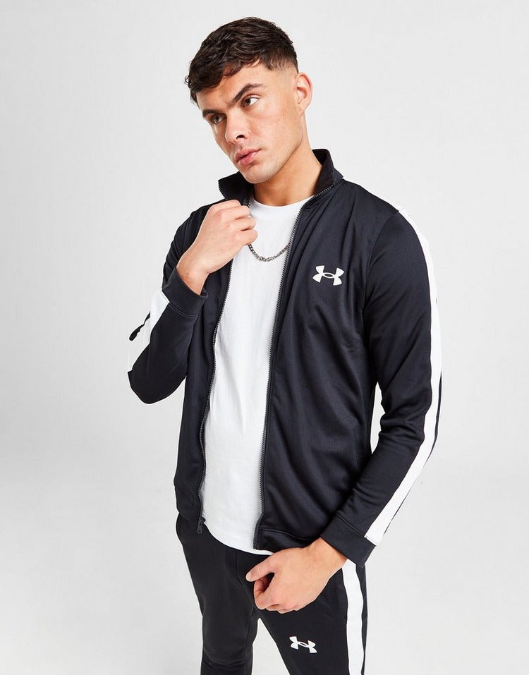 Stay fresh in between workouts with this men's Poly Tracksuit from Under Armour. In a Black colourway, this standard-fit set is made with smooth, lightweight polyester for lasting comfort. It features a long-sleeve track top with a full-zip fastening and a raised collar for a custom look. The matching track pants have an elasticated waistband with a drawcord to adjust the fit, while stretchy ribbed trims throughout deliver a secure, streamlined feel. With pockets for easy storage, it's finished with contrasting White panels down the sides, and classic Under Armour branding at the chest and thigh. Machine washable. | Our model is 6'2" with a 37" chest and wears a size medium.