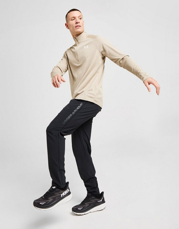 Train unrestricted at the gym in this men's Tech Textured 1/4 Zip Top from Under Armour. In a City Khaki colourway, the slightly textured UA Tech fabric has a soft and more natural feel to it whilst wicking sweat from the skin for a dry wear. It features a quarter zip fastening and stand-up collar for custom coverage. Finished with raglan sleeves and UA badges to the chest and nape. Machine washable. | Our model is 6'0" with a 39" chest and wears a size M.
