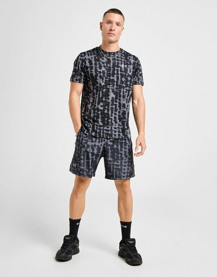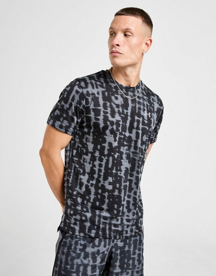 For explosive training sessions, take off in this men's UA Launch Print T-Shirt from Under Armour. In a Black and Grey digital camo print, this streamlined workout top is made from smooth, lightweight and breathable fabric that dries quickly and wicks sweat from the skin. Buit with four-way stretch for unrestricted movement, it's finished off with reflective taping down the nape and the signature Under Armour logo on the chest. Machine washable. | Our model is 6'0" with a 40" chest and wears a size M.