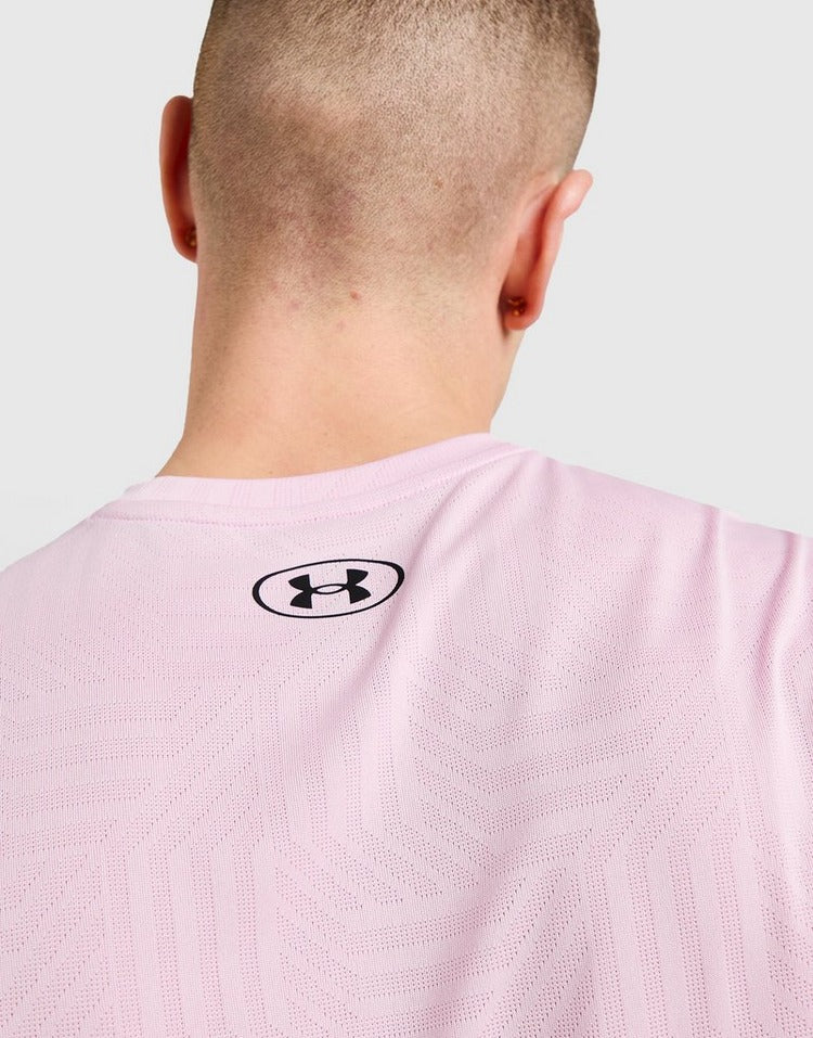 Turn heads in the gym with this men's Vent Geotessa T-Shirt from Under Armour. In a Prime Pink colourway, this 4-way stretch training top has a tonal geometric pattern all over. It's made from breathable, lightweight and sweat-wicking UA Tech fabric to keep you cool. Signed off with a Black Under Armour badge to the chest and on the nape. Machine washable. | Our model is 6'0" with a 39" chest and wears a size M.