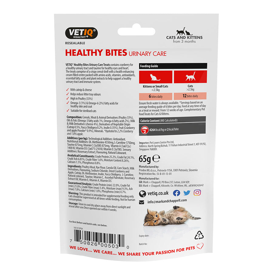 VETIQ Healthy Bites Urinary Care help to maintain a healthy urinary tract. The unique delivery system enables them to deliver the functional ingredients in a delicious creamy filling. Each creamy bite contains Cranberry for healthy urinary tract, taurine for healthy eyes and heart, a source of prebiotic fibre to assist digestion and Catnip to stimulate exercise and play and Yucca plant extract to reduce litter tray odours.