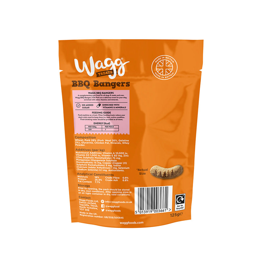 A complementary pet food for all dogs 8 weeks and over. Wagg BBQ Bangers with Pork Sausage is a delicious treat for your dog, enriched with extra vitamins and minerals. Every treat is oven baked to lock in nutrition and flavour. That makes it a very special treat indeed for the dog you love.