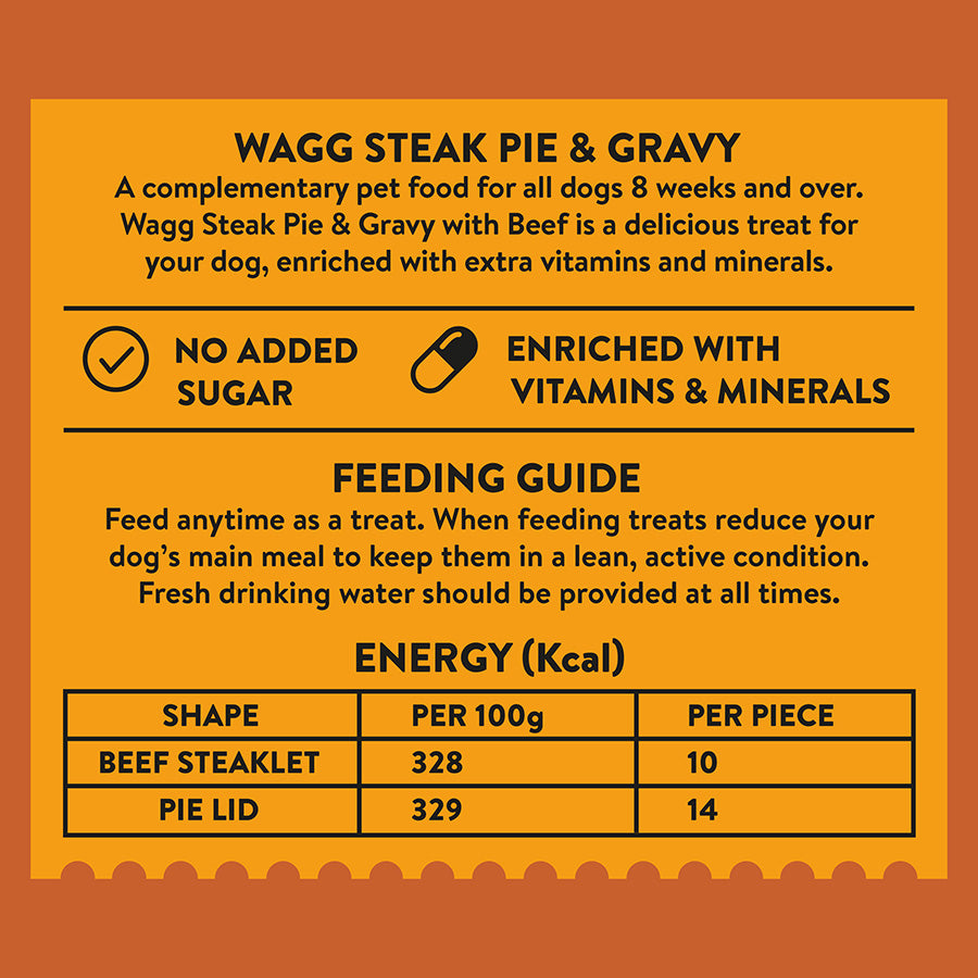 Not fine-dining, pampered-pet, pay-through-the-nose nonsense. A complementary pet food for all dogs 8 weeks and over. Wagg Steak Pie and Gravy with Beef is a delicious treat for your dog, enriched with extra vitamins and minerals. With no artificial colours, flavours or added sugar, every treat is oven baked to lock in nutrition and flavour. That makes it a very special treat for the dog you love.