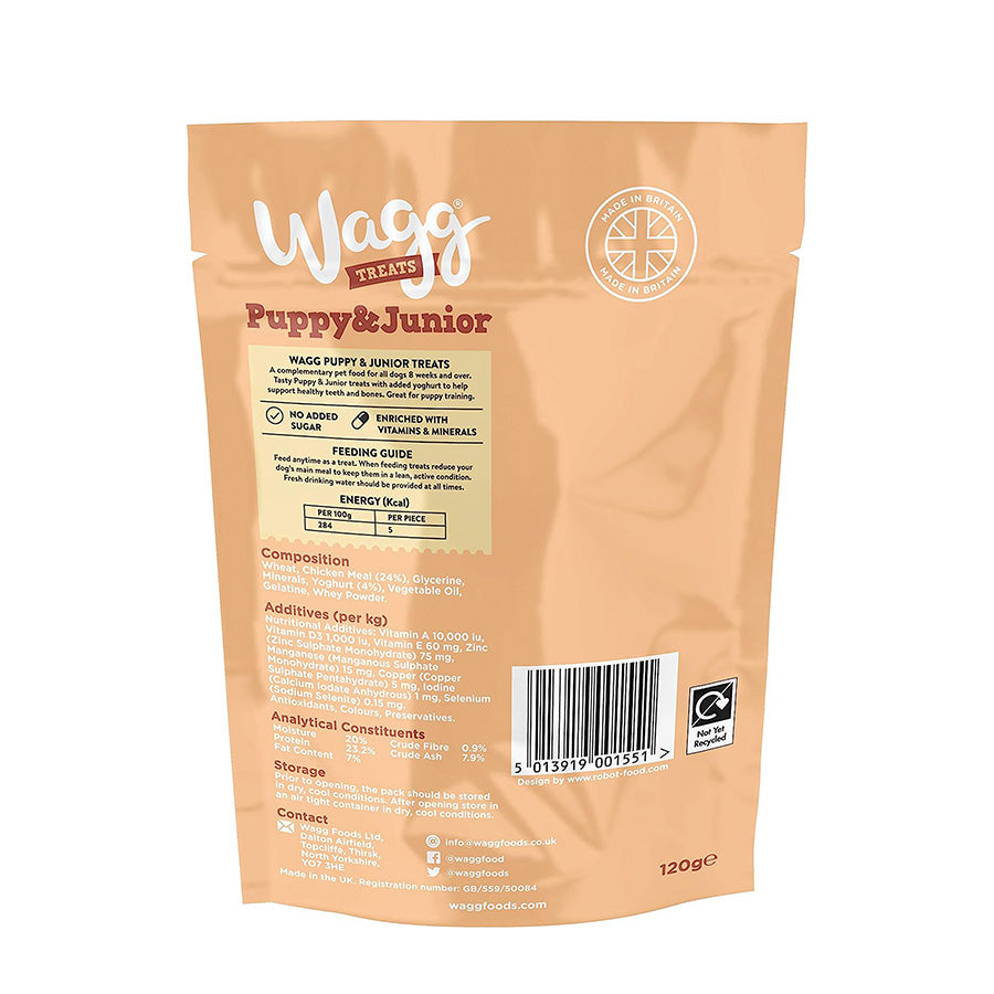 A complementary pet food for all dogs 8 weeks and over. Tasty Puppy and Junior treats with added yoghurt to help support healthy teeth and bones. Great for puppy training. With added calcium from yoghurt and with no added sugar and no artificial colours or flavours. Like all Wagg treats, the Puppy Junior Treats are oven baked which improves palatability and texture.
