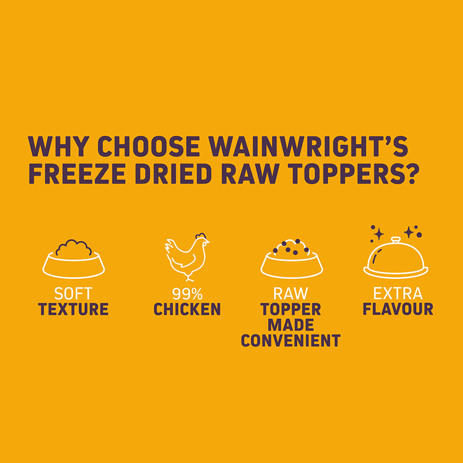 Why Choose Wainwright's Raw Freeze Dried Toppers? The soft sprinkle texture makes it perfect for all dog life stages. This is raw toppers made convenient. With wholesome ingredients which are gentle on digestion, this recipe boasts 99% chicken for a natural goodness of protein, with the added benefit of no added artificial colours, flavours or preservatives. All of this combined adds that extra bit of tasty flavour to your dog's meal time making it a great meal booster.