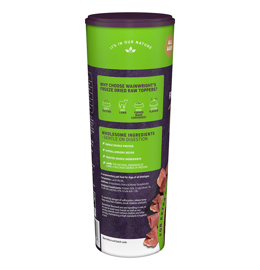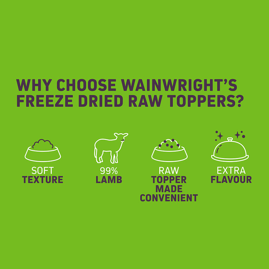 Why Choose Wainwright's Raw Freeze Dried Toppers? The soft sprinkle texture makes it perfect for all dog life stages. This is raw toppers made convenient. With wholesome ingredients which are gentle on digestion, this recipe boasts 99% lamb for a natural goodness of protein, with the added benefit of no added artificial colours, flavours or preservatives. All of this combined adds that extra bit of tasty flavour to your dog's meal time making it a great meal booster.