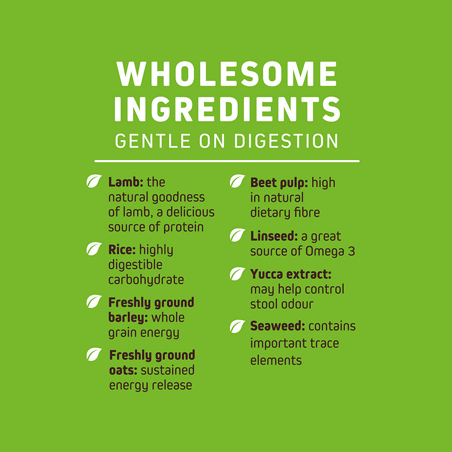 Lamb (33%) (Dried Lamb 28%, Freshly Prepared Lamb 5%), Rice (26%), Whole Grain Barley (21%), Beet Pulp (6%), Whole Ground Oats (4.5%), Rapeseed Oil, Dried Peas (3% equivalent to 12.5% Peas), Linseed (2%), Dried Carrots (1% equivalent to 8% Carrots), Seaweed (0.2%), Glucosamine (0.05%), Yucca Extract (0.02%), Chondroitin (0.015%)