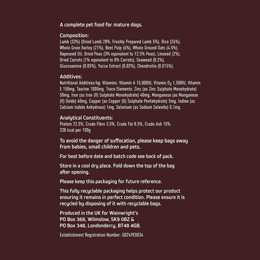 Wainwright's Mature Lamb and Rice with Vegetables is a complete balanced dry food made with a single source protein that your dog will love. Made with a hypoallergenic recipe with no added wheat, dairy, soya or artificial flavours, colours or preservatives, you can be assured the highest quality natural ingredients have been chosen with care and freshly prepared with pride in the UK.