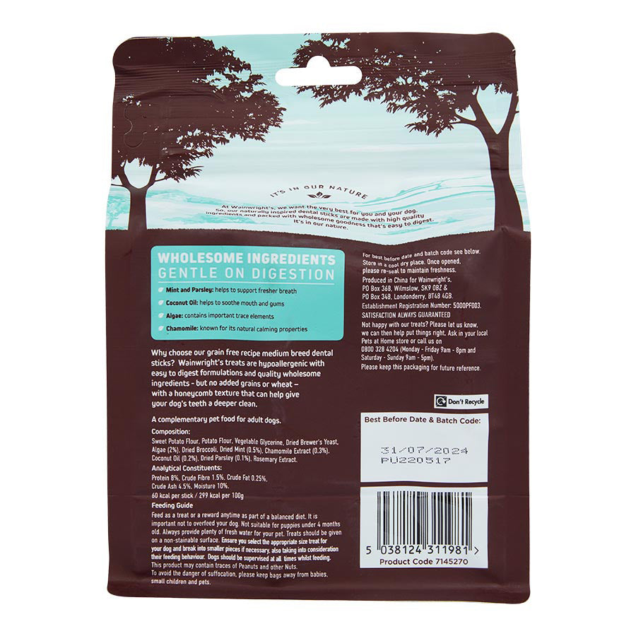 Wainwright's Medium Breed Dog Dental Sticks with Mint and Parsley are the perfect accompaniment to your dog's diet. The vegetarian recipe is a source of plant based protein and the honeycomb texture can help your dog's teeth and gums. The recipe is gentle on digestion with mint and parsley to help freshen breath and coconut oil to sooth the mouth and gums. They also include chamomile, known for its natural calming properties, making these Sticks a great addition to their bedtime routine. As with all Wainwright's treats, they have none of the most common allergens, so you know exactly what your dog is eating.