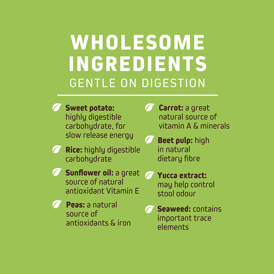 Sweet Potato (27%), Rice, Maize Gluten, Sunflower Oil, Peas (7.5%), Minerals, Vegetable Stock, Beet Pulp (2%), Dried Carrot (1%, equivalent to 8.3% Carrots), Alfalfa, Seaweed meal (0.5%), Chicory Root Extract (as a source of prebiotic FOS) (0.1%), Dried Broccoli (0.05%, equivalent to 0.45% Broccoli), Dried Rosehip, Dried Parsley, Dried Thyme, Yucca Extract (0.02%), Glucosamine (0.02%), Chondroitin (0.015%), Dried Spearmint