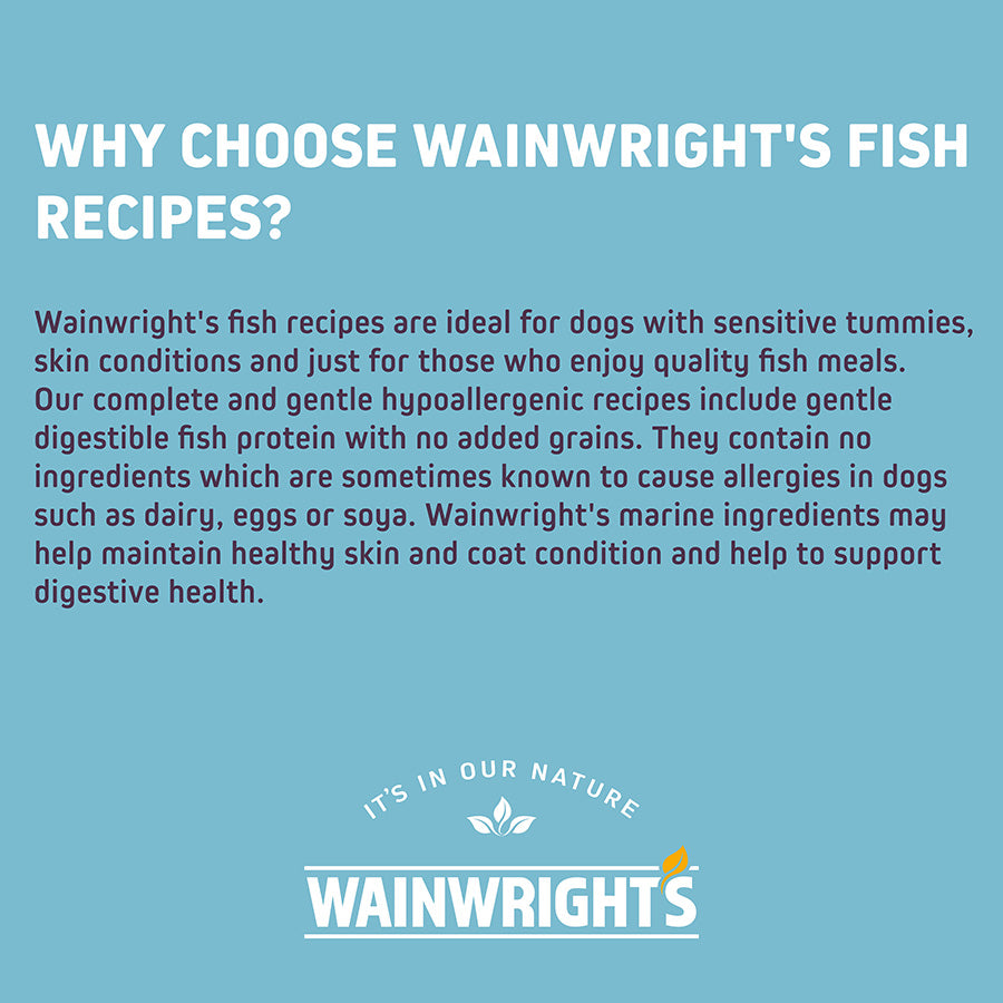 Wainwright's Dry Adult Dog Food Atlantic Salmon with Superfoods is a complete balanced dry food made with a single source protein that your dog will love. Made with a hypoallergenic recipe with no added wheat, pork, dairy, soya, artificial flavours, colours or preservatives, you can be assured the highest quality natural ingredients have been chosen with care and freshly prepared with pride in the UK.