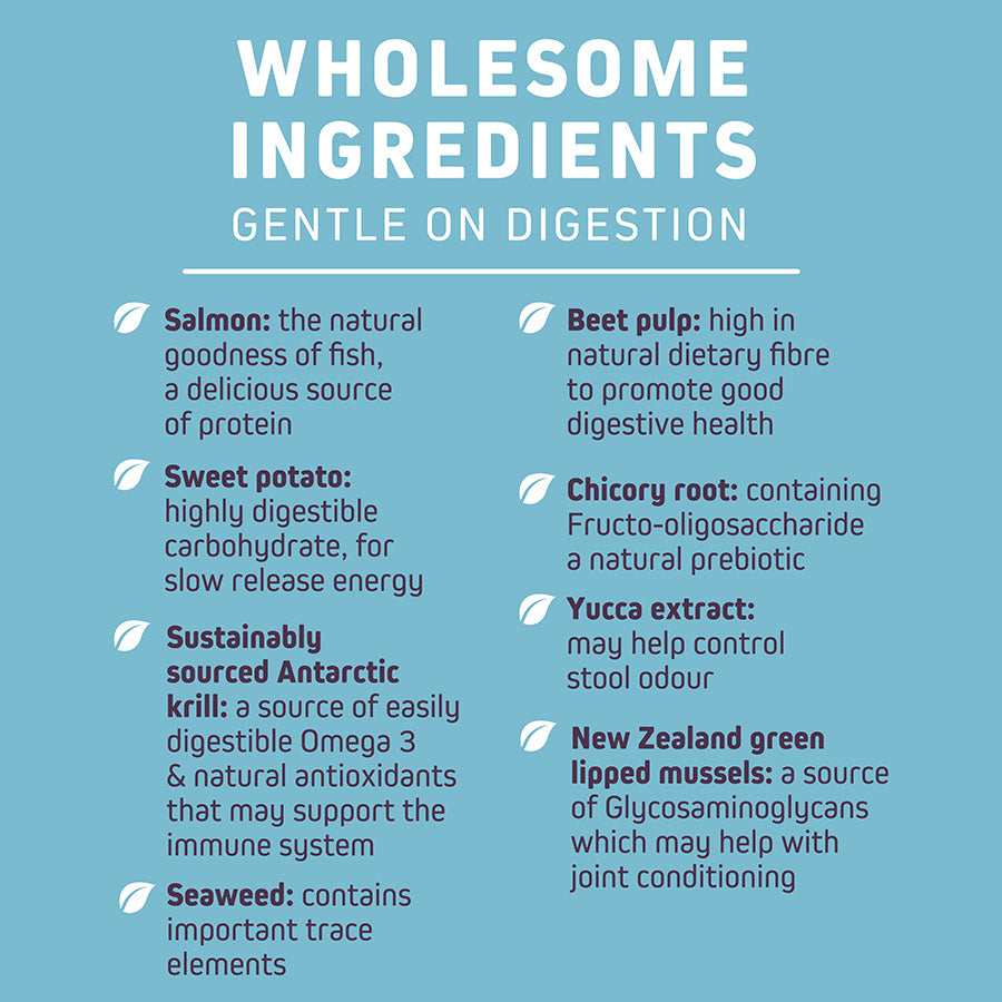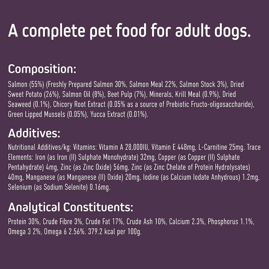 Salmon (55%) (Freshly Prepared Salmon 30%, Salmon Meal 22%, Salmon Stock 3%), Dried Sweet Potato (26%), Salmon Oil (8%), Beet Pulp, Minerals, Krill Meal (0.9%), Dried Seaweed (0.1%), Chicory Root Extract (0.05% as a source of Prebiotic Fructo-oligosaccharide), Green Lipped Mussels (0.05%), Yucca Extract (0.01%)