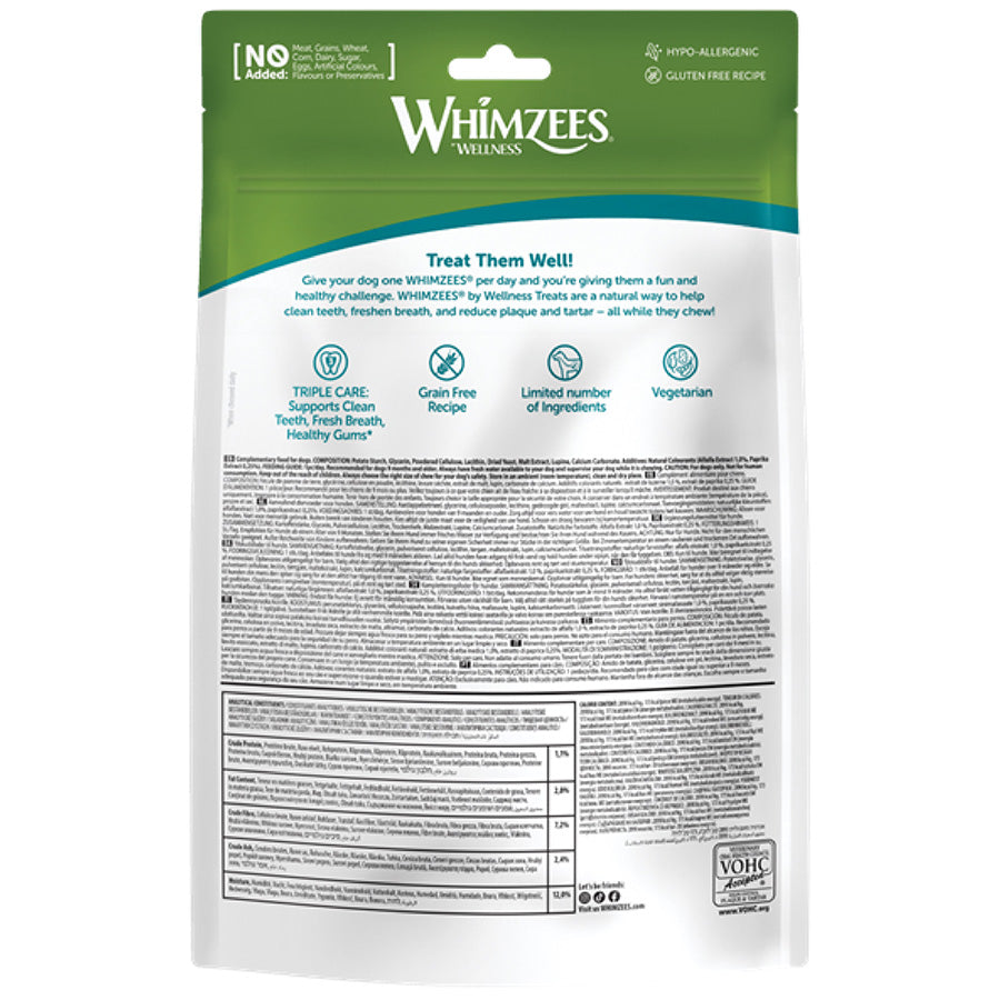 Whimzees Daily Dental Treats are proven to help clean teeth and freshen breath by reducing the build up of plaque and tartar as the product is chewed and moved around the mouth. All-natural with 6 primary, plant-based ingredients. Vegetarian, low fat, NO Gluten, preservatives, added sugar or GMO. Grain Free (with the exception of Ricebone which contain rice).