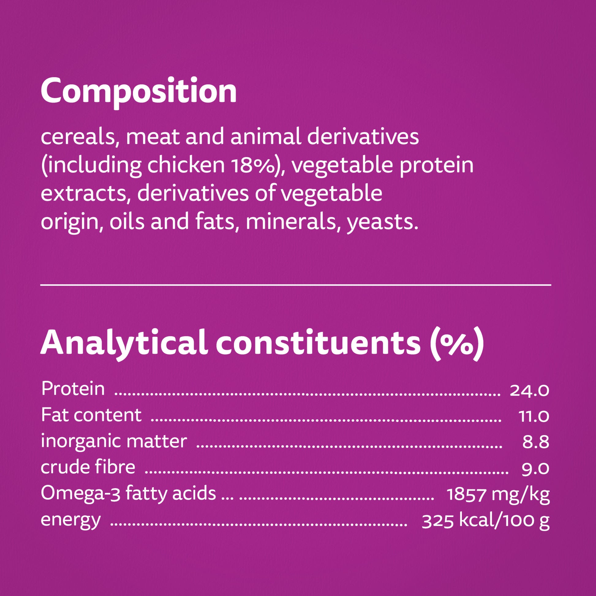 Cereals, Meat and Animal Derivatives (including Chicken 18%), Vegetable Protein Extracts, Derivatives of Vegetable Origin, Oils and Fats, Minerals, Yeasts.