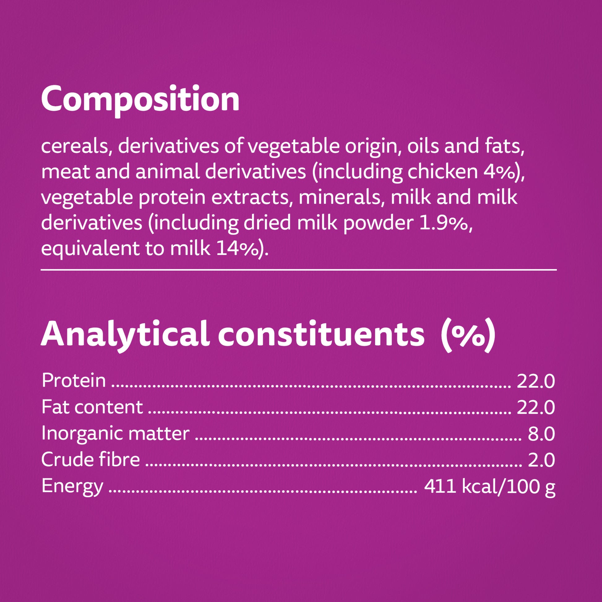 Cereals, Derivatives of Vegetable Origin, Oils and Fats, Meat and Animal Derivatives (including Chicken 4%), Vegetable Protein Extracts, Minerals, Milk and Milk Derivatives (including Dried Milk Powder 1.9%, equivalent to Milk 14%).