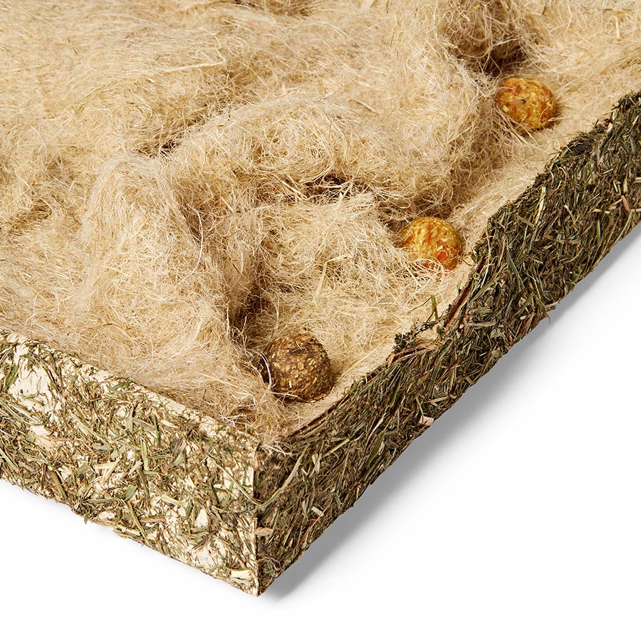 Grain-Free Herb and Veg Drops: Pea Flour 59.7%, Dried Carrots 11.2%, Vegetable Starch 9.1%, Dried Parsley 4%, Dried Dandelion 3.5%, Dried Beetroot 2.5%, Dried Ribwort 2.1%, Timothy Grass 1.6%, Dried Nettle 1.5%, Cocksfoot 1.3%, Smooth Stalk Meadow Grass 0.9%, Oat Herb 0.8%, Red Clover 0.6%, Meadow Fescue 0.6%, Dried Ladies Mantle 0.6%; Hay Coated Tray: Hay 38.5%, Vegetable Starch 36.2%, Cellulose Board 25.3%; Hemp Mat: Hemp 100%